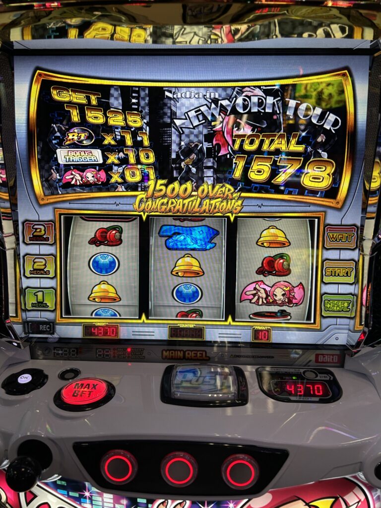 これだけループすると気持ちいいですな。さすがに奇数設定ですかね。アクロス系にもあるリーチ目ミッションがこの台もあるので、それを埋めたいなと打ちながら思い、左の7中段とナディア中段はビタすれば成立後(BIG揃えるとき)に簡単に止まるので、これはすぐにクリアできるのですが、右中段のサボスイカの1確が中々止まらなかったので、ようやく止まった時の画像がこれです。