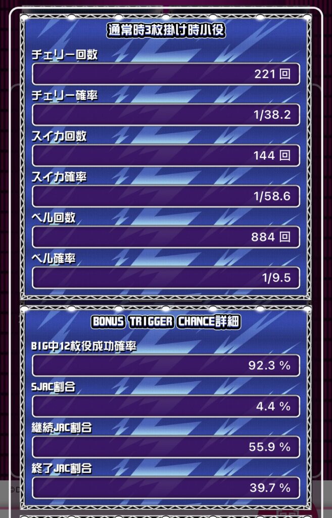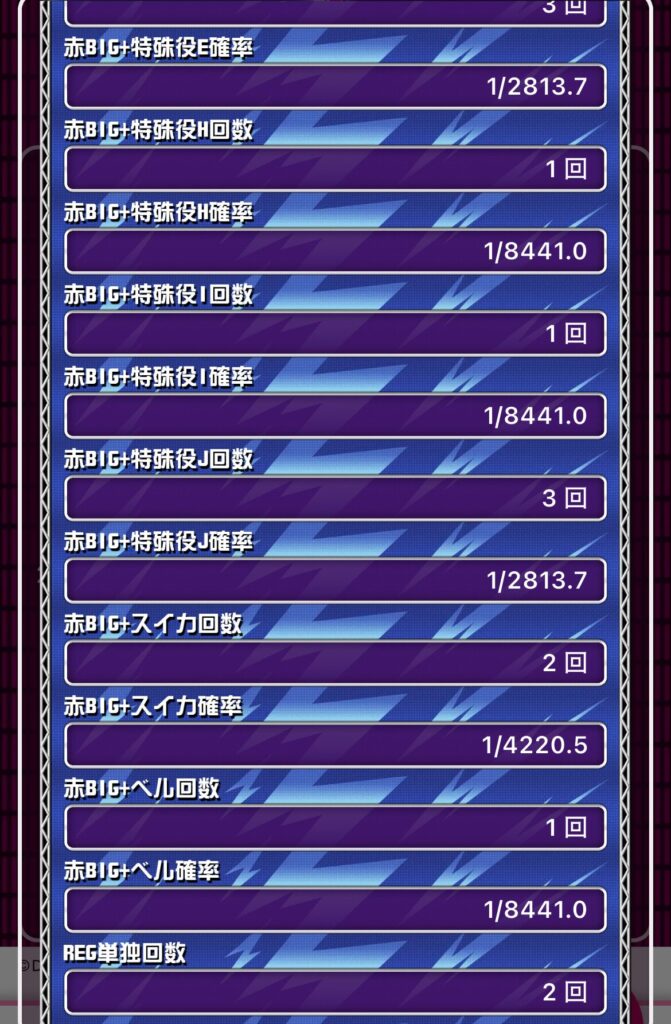 BIGは設定2以上6以下で引けてて、REGは設定5以上2以下の確率。BTのループ率はほぼほぼ5の数値、小役の確率が設定1しか判明していないですが、チェリーは1以下ですが、ベルとスイカの落ちはいいですね。ただ結構重要そうなのが、
