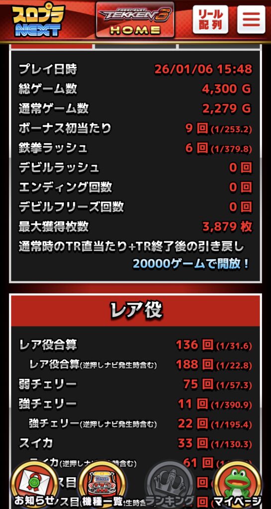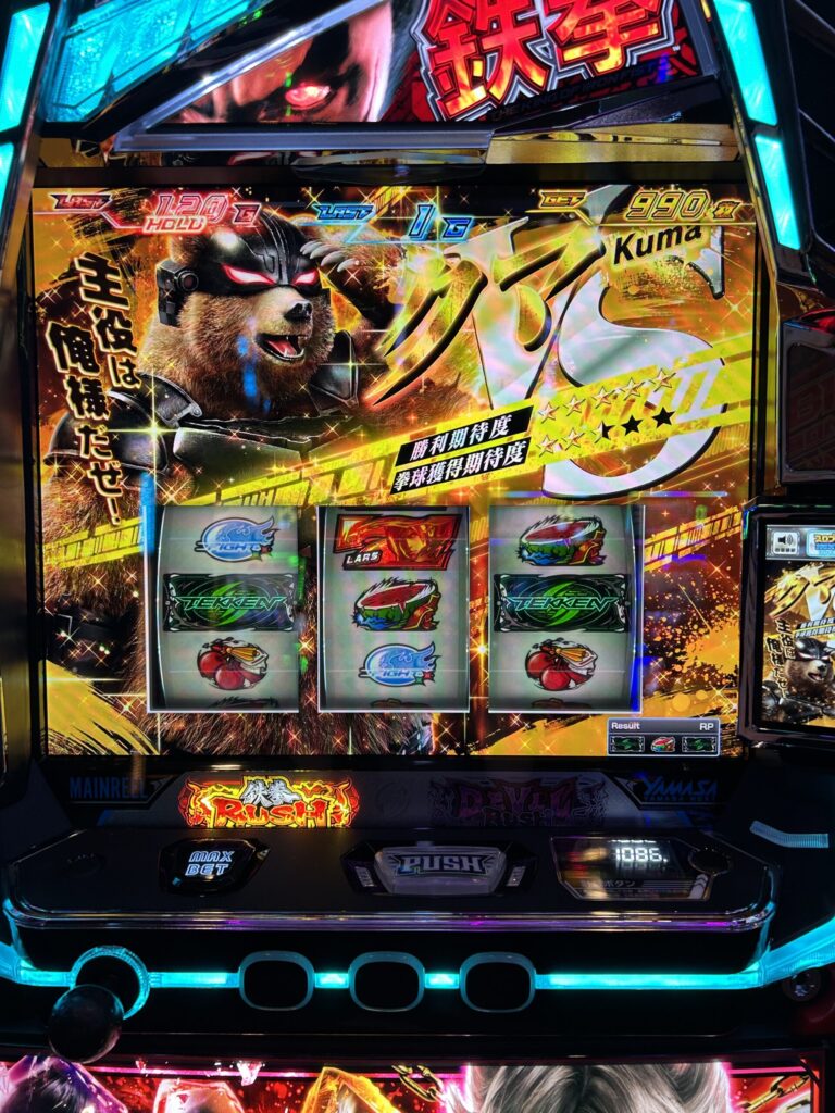 打ち始め、朝一はまぁいいとして、その後も結構ぱっとしない展開で、気づいたら2回目の600pt超えを喰らい自分で考えていた見切るタイミングが来たなと考えていたところ、これで最後と思っていたATが結構伸びてくれて、ようやく鉄拳チャンスなんかも入ってくれたり、