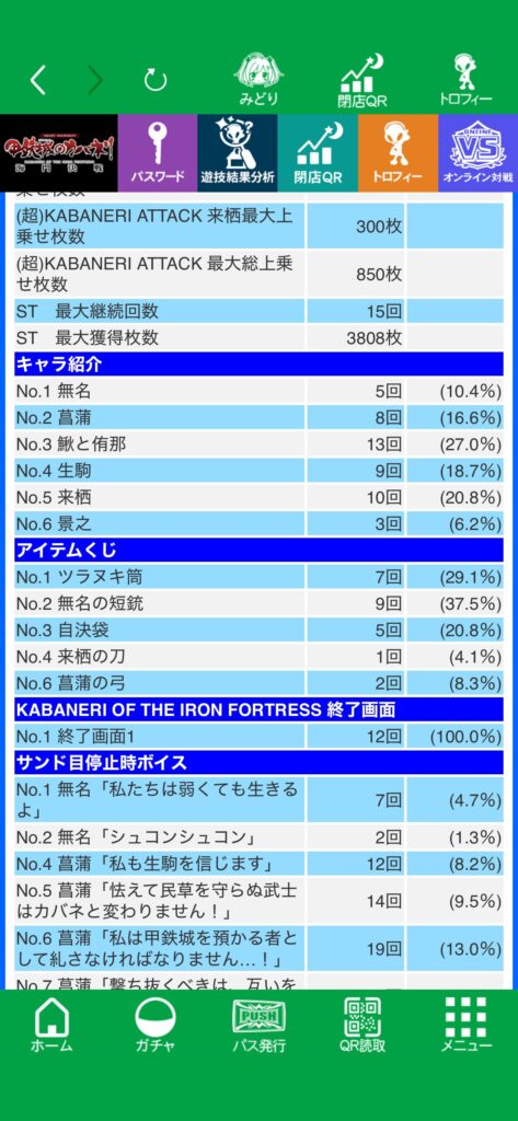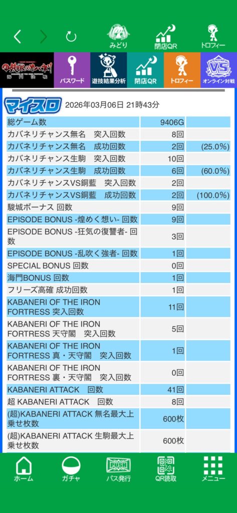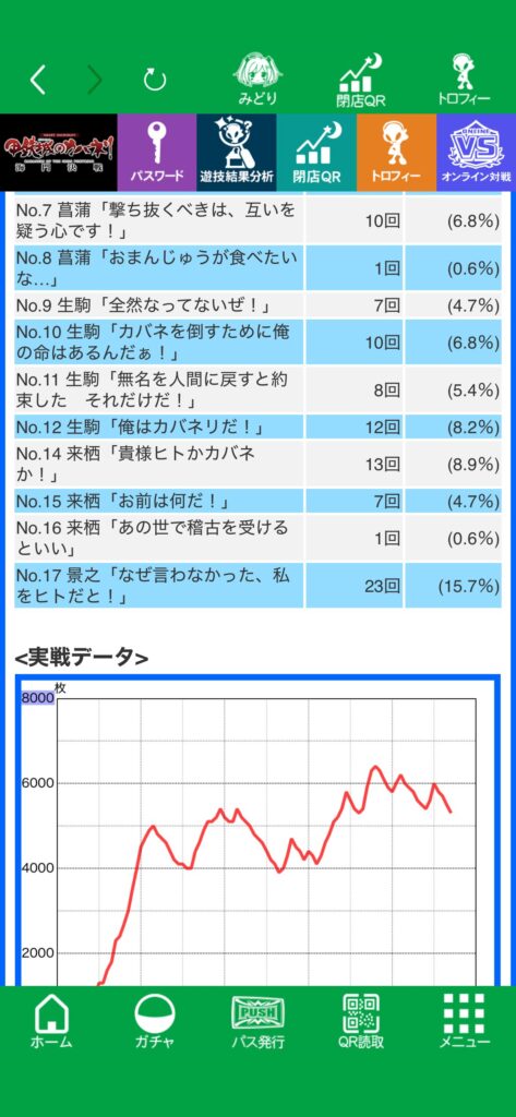 結局設定の良し悪しがわからないまま終日粘り、後半は大した展開はなく、おそらく上ではないと思います。隣の台から456確の美馬が出てたりしていたので、回転数回せばまぁまぁ何かしらの示唆は出そうな気がするのですが、私の台からは何も出現しなかったのと、設定差があると言われている3周期目の当選が0だったので、おそらく上ではないかと、下段ベルも悪かったですし。それで終日打っているのはどうかと思いますが。最後に実践データと、マイスロ貼っときます。