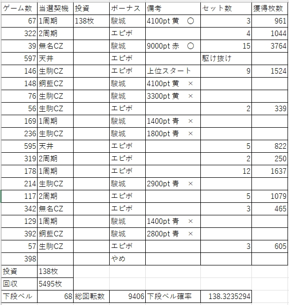 打ち始め1周期目でボーナス当選ですが、駿城。しかしこれが4100ptでエピボに昇格。いい挙動なのではないでしょうか(判断するには早いですが)。これが3セットの961枚。